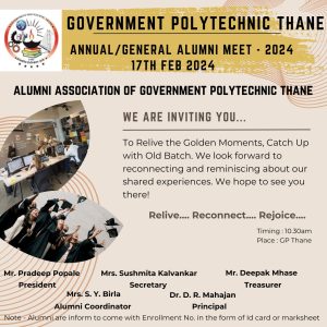 Government Polytechnic, Thane Alumni Association (GPTAA), established in 2015, maintains a long-lasting connection between the Institute and its members. Dedicated volunteers work with the Alumni Association to develop an active alumni network. Whether it’s volunteering, attending events conducted by the Institute or participating in the Institute’s diverse legacy projects – active and involved alumni’s add phenomenal value to this institute, which in turn helps preserve its position as one of the world’s premier institutes.